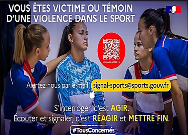 En cas de violence, victime ou témoin, vous pouvez signaler les faits à : signal-sports@sports.gouv.fr